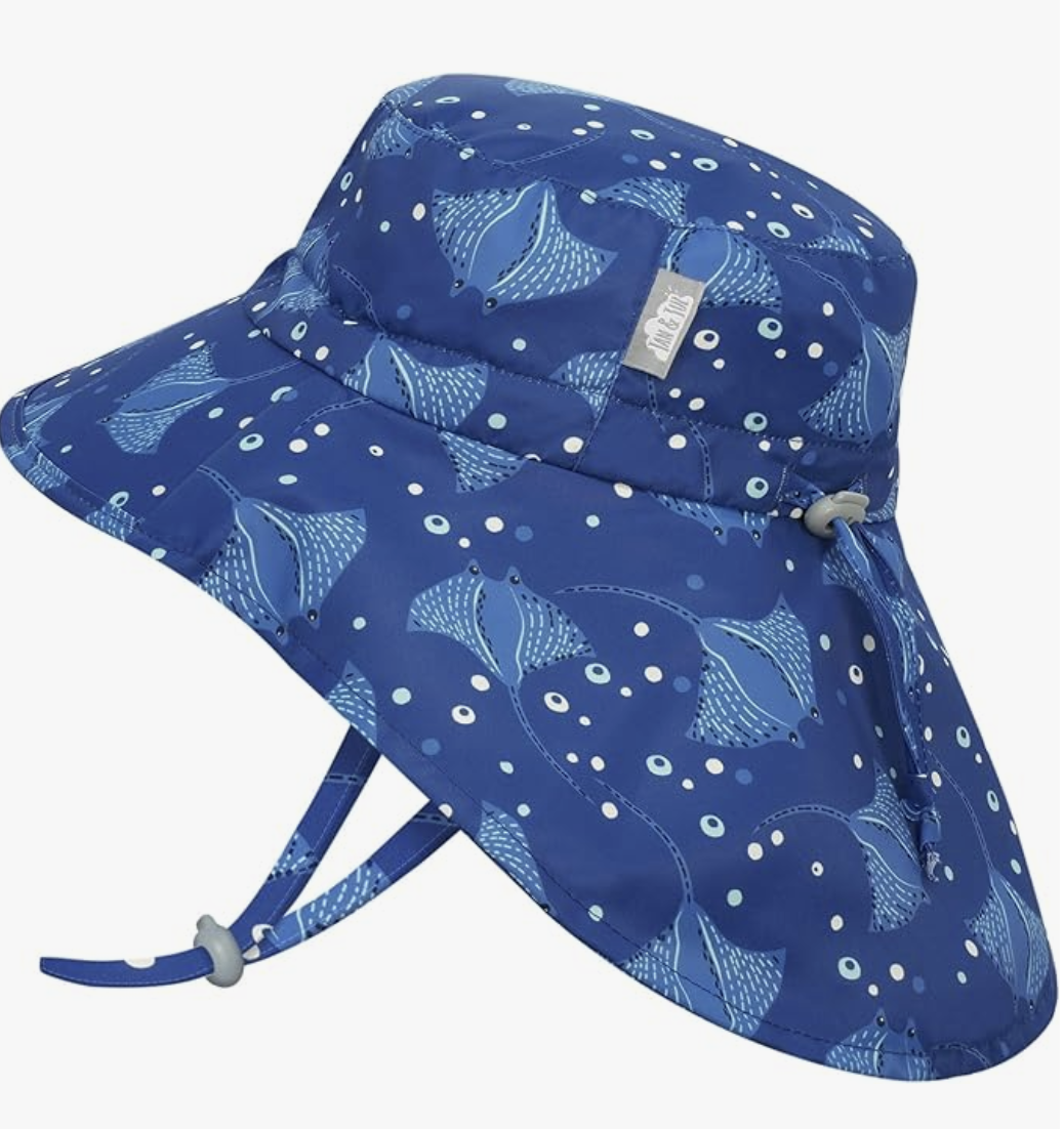 This is the hat my son could wear starting around 3-4 months. I loved it because it comes in a ton of adorable prints for both boys and girls. It’s adjustable with their age and has a longer backing to cover the nape of the baby’s neck.